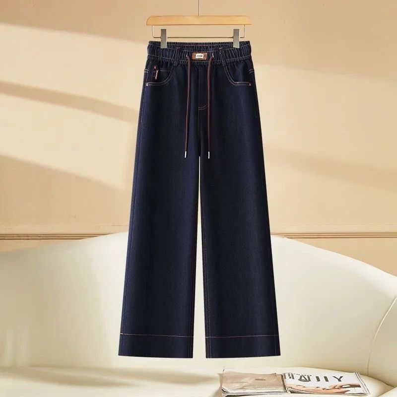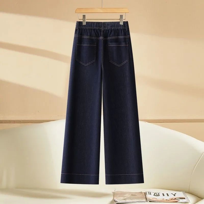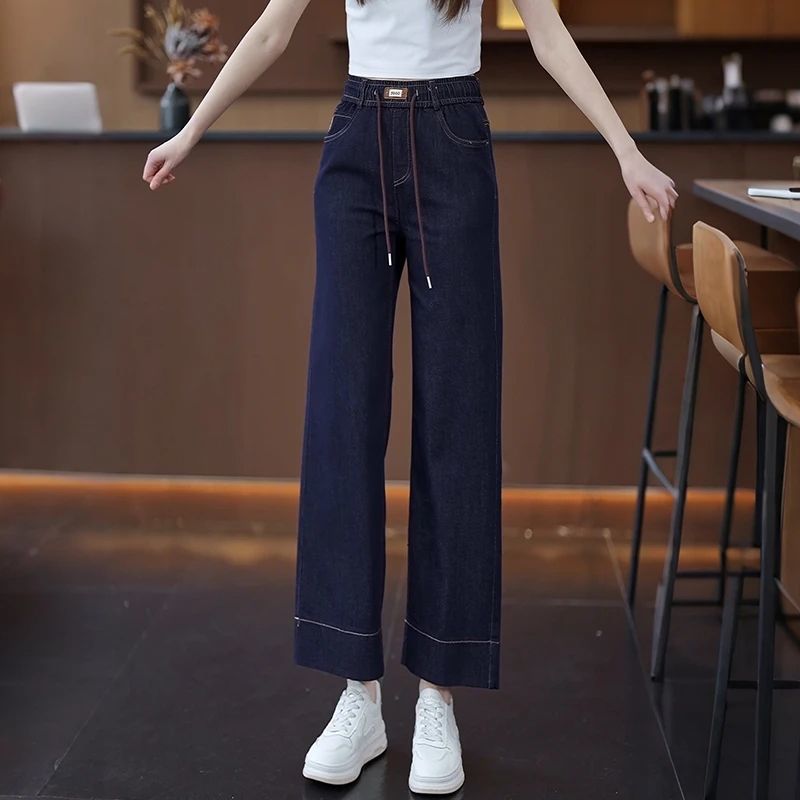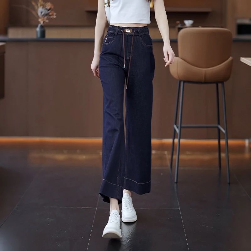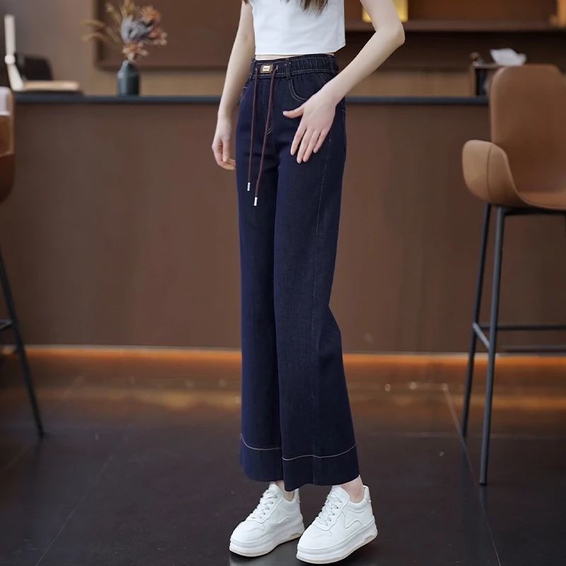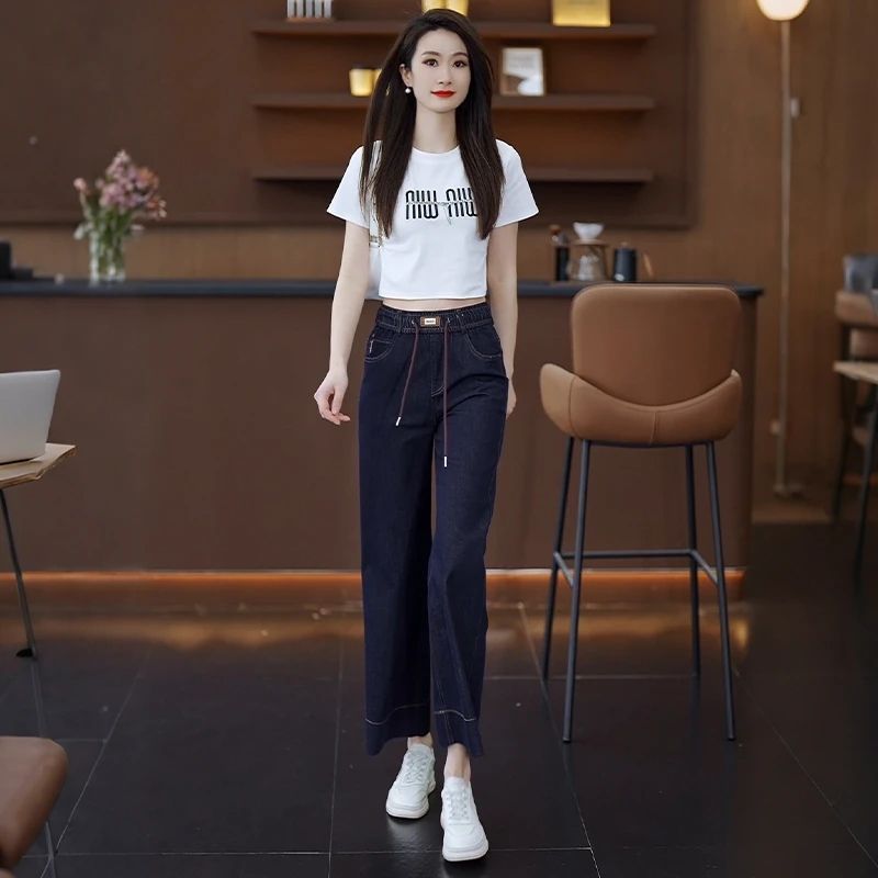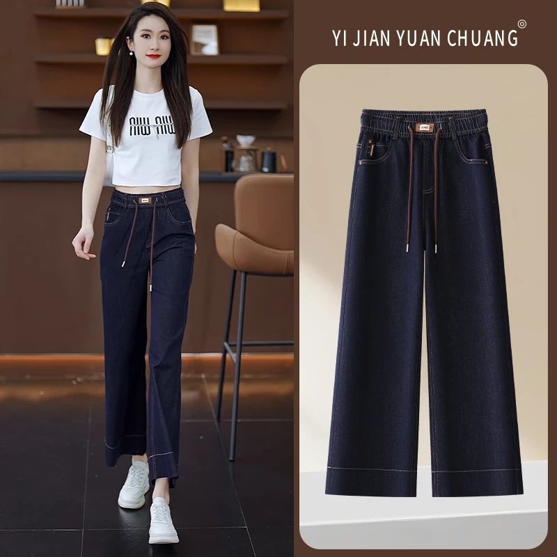 九分牛仔阔腿裤女2025夏季新款松紧高腰显瘦小个子垂感直筒休闲裤