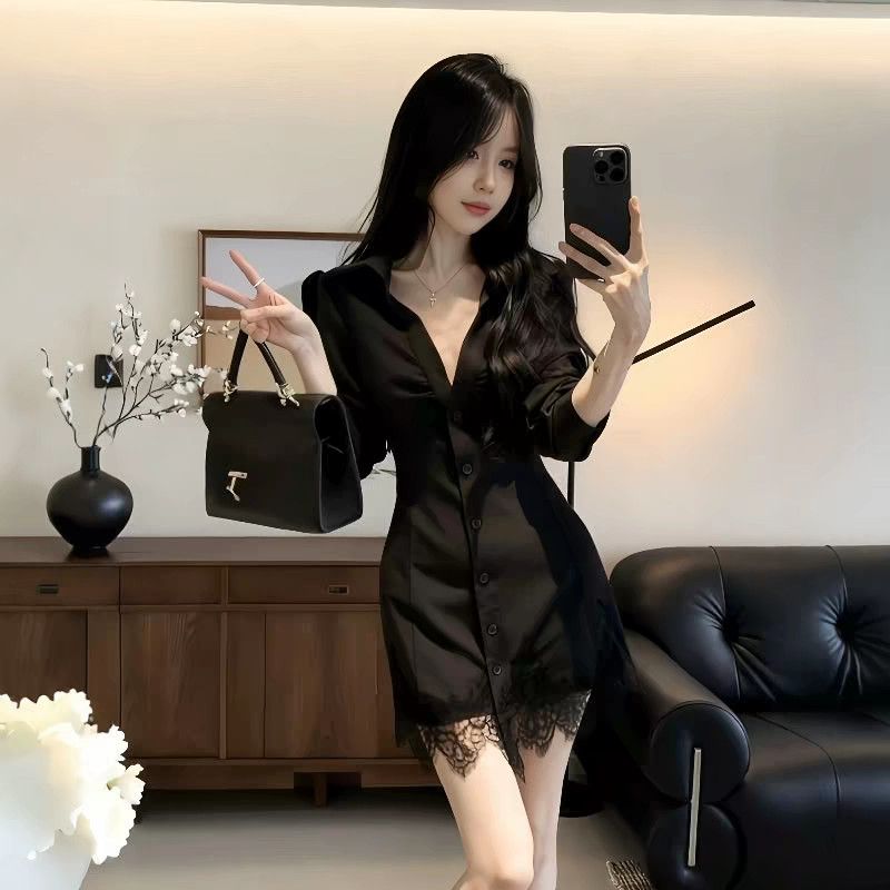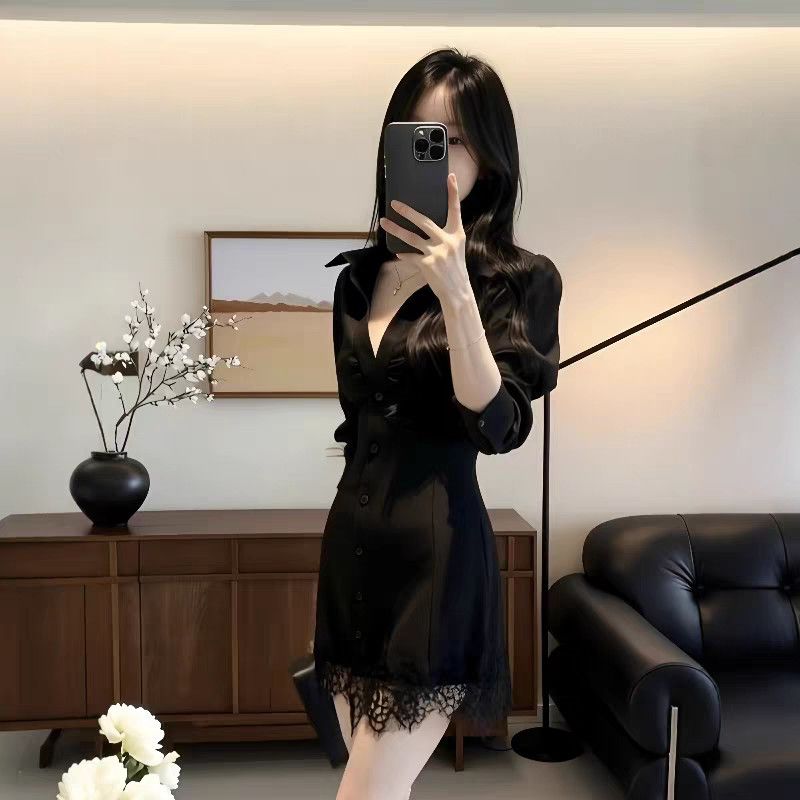 黑色蕾丝拼接长袖连衣裙子女衬衫秋季2025新款赫本风包短裙求职季【3天内发货】