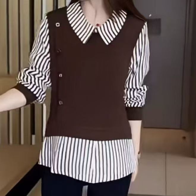 2025两件洋气显瘦新款时尚秋季条纹拼接打底上衣妈妈长袖衬衫