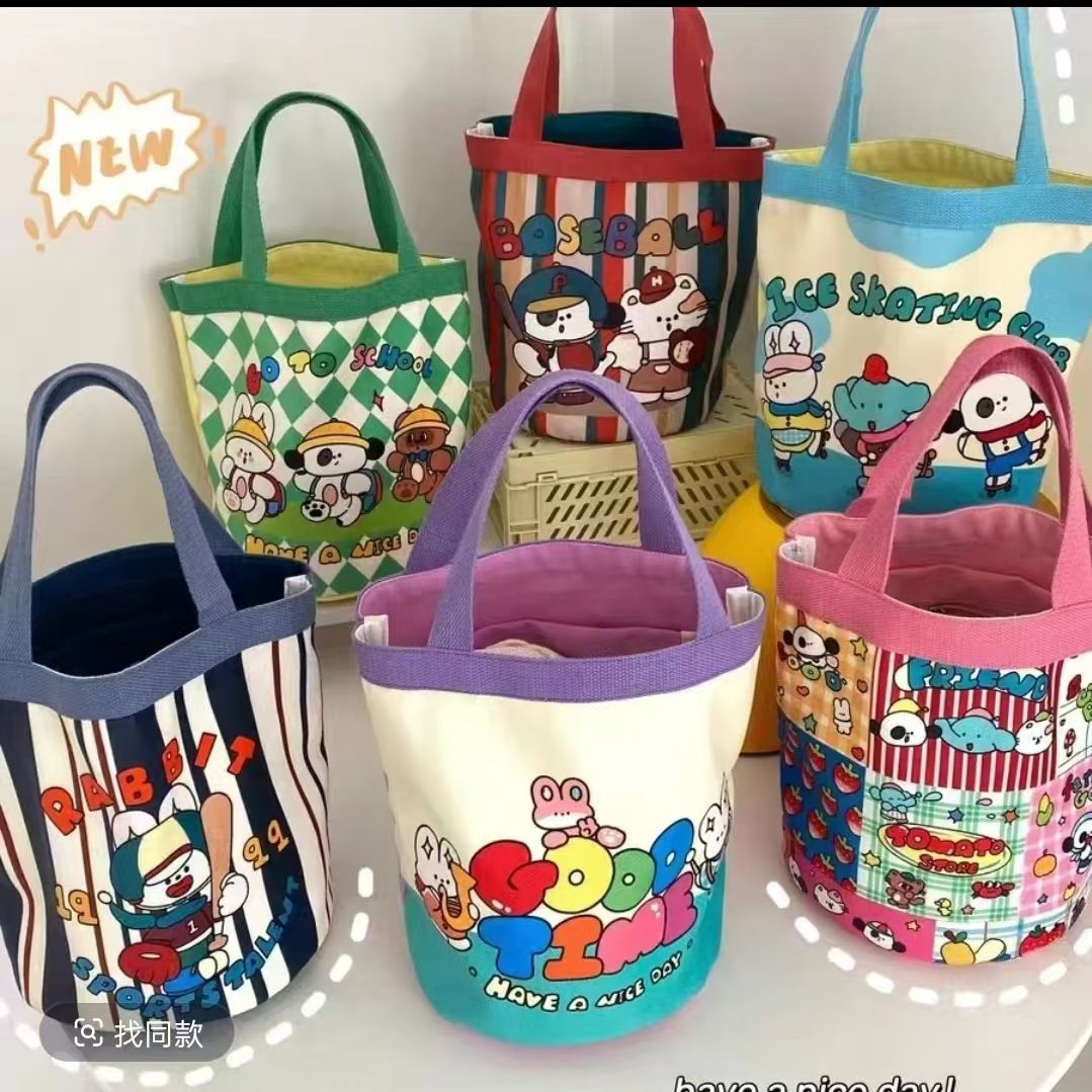 可爱涂鸦水桶包ins印花圆筒包帆布便当袋韩风少女手拎饭盒妈咪包【10天内发货】